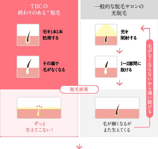 終わりのある脱毛「TBCスーパー脱毛」:一定期間の施術で、毛が生えてこなくなることを目指せる脱毛法です。